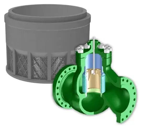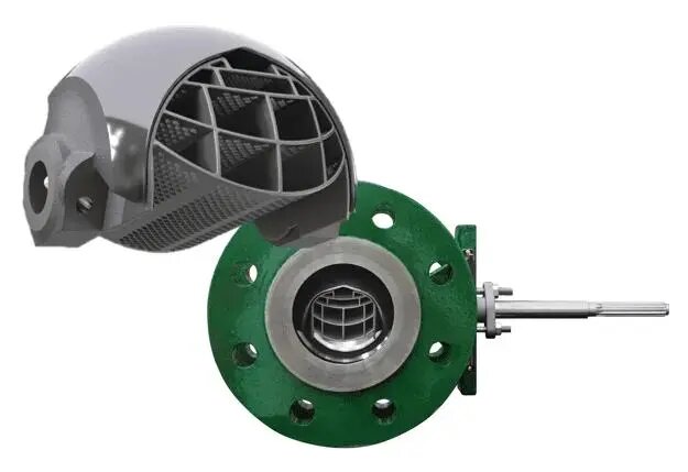 02.对于Fisher Vee-Ball阀门来说,采用增材制造技术的Whisper NXV阀内件可以解除阀内件的结构设计限制,从而提高了流量效率。在传统的制造方法中,为了制造和装配,可能需要在阀内件周围留出额外的空间。Whisper NXV阀内件没有空隙地填补了整个阀球,并保留一个光滑的进口。这种设计显著减少了通过阀门的非可控湍流。